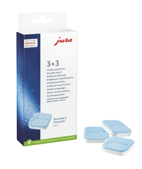 Om de levensduur van uw koffie-volautomaat te verlengen, heeft JURA een 2 in 1 ontkalkingstablet ontwikkeld dat de kalk zacht verwijdert en tegelijk uw volautomaat ontziet.