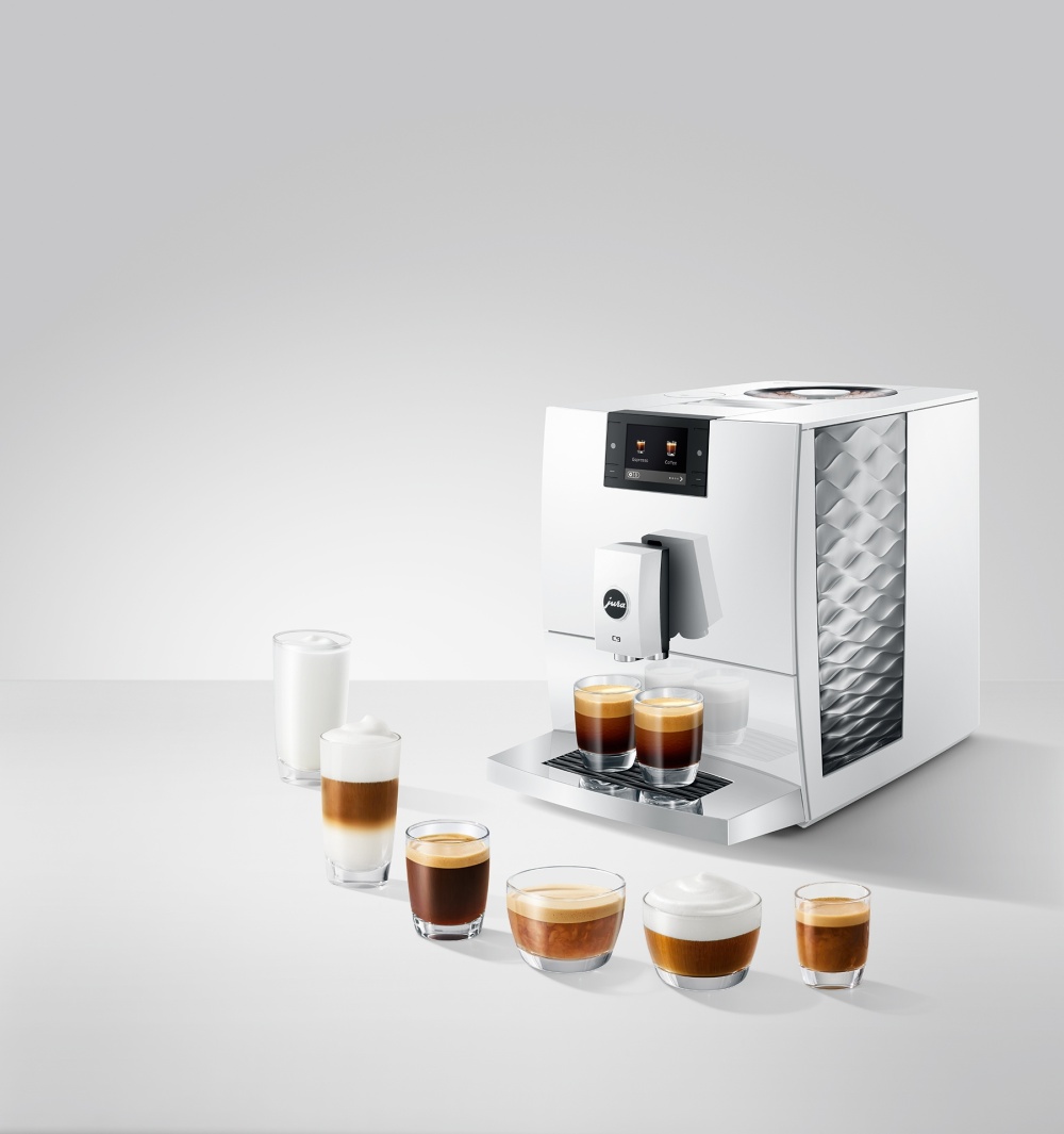 Het ontwerp van de compacte C9 is gebaseerd op de premiumklasse van JURA. Golfvormige structuren verlenen het waterreservoir vorm en accentueren het verchroomde kopjesplateau. De convex-concave voorzijde straalt elegantie en klasse uit en integreert het 2,8 inch kleurenscherm harmonieus in het totaalbeeld.